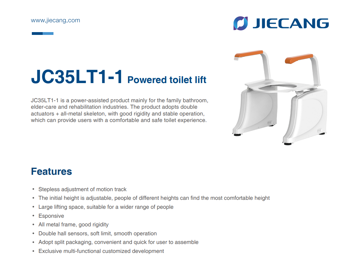 Por exemplo, este modelo de elevação do banheiro Jiecang JC35LT1-1 é um produto assistido por poder usado principalmente em banheiros familiares, cuidados com idosos e indústrias de reabilitação. Ele utiliza atuadores duplos e uma estrutura de metal, oferecendo excelente rigidez e operação estável, garantindo uma experiência de banheiro confortável e segura.
